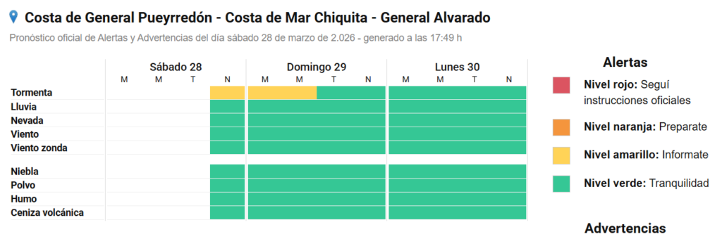 El Servicio Meteorológico Nacional (SMN) emitió una nueva alerta amarilla para la noche de este sábado, que se suma a la ya vigente para la madrugada y la mañana del domingo en Mar del Plata y la zona.