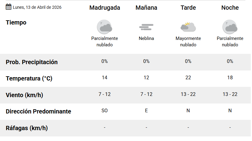 La jornada comenzará con neblina, una temperatura cercana a los 12° y viento leve del este. Con el correr de las horas, se espera una mejora en las condiciones, con una máxima que alcanzará los 22° durante la tarde.