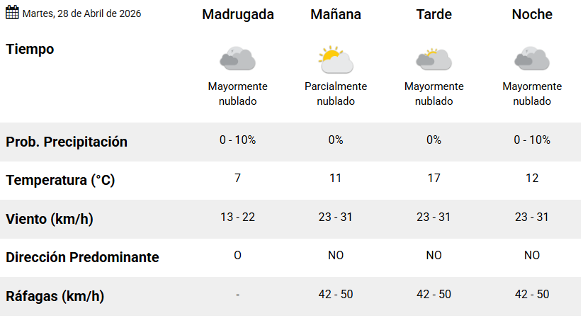 En cuanto al viento, se mantendrá durante todo el día con velocidades entre 23 y 31 km/h, con ráfagas que podrían alcanzar entre 42 y 50 km/h, predominando del sector noroeste. La probabilidad de lluvias será baja, entre 0 y 10%.