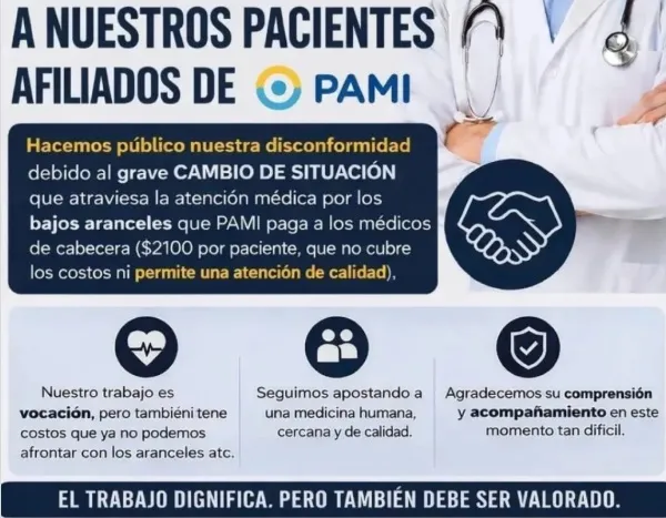 Médicos autoconvocados de PAMI participarán este miércoles 22 a las 12 de la Comisión de Salud del Concejo Deliberante, donde expondrán sobre la situación que atraviesa el sector, marcada por recortes y una deuda acumulada. Según indicaron, actualmente perciben $2.100 por paciente por mes y pidieron el acompañamiento de la comunidad.