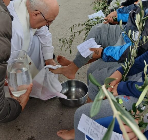 En el marco de la Semana Santa, presidió la Eucaristía y llevó el mensaje propio de esta celebración, realizando también los gestos litúrgicos tradicionales. En ese contexto, bendijo los ramos y replicó el gesto de Jesús en la Última Cena al lavar los pies a internos y personal penitenciario.