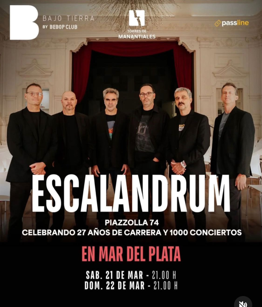 El prestigioso sexteto argentino Escalandrum se presentará el sábado 21 y domingo 22 de marzo a las 21 en Bajo Tierra, en Torres de Manantiales, con su espectáculo “Piazzolla 74”.