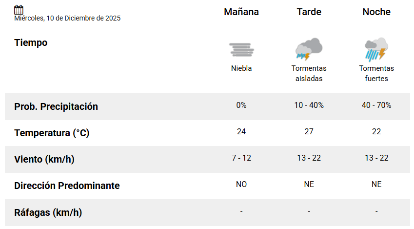 De acuerdo al pronóstico diario, el viento aumentará especialmente durante el jueves, mientras que para este miércoles por la tarde y noche se prevén intensidades de 13 a 22 km/h desde el sector noreste.