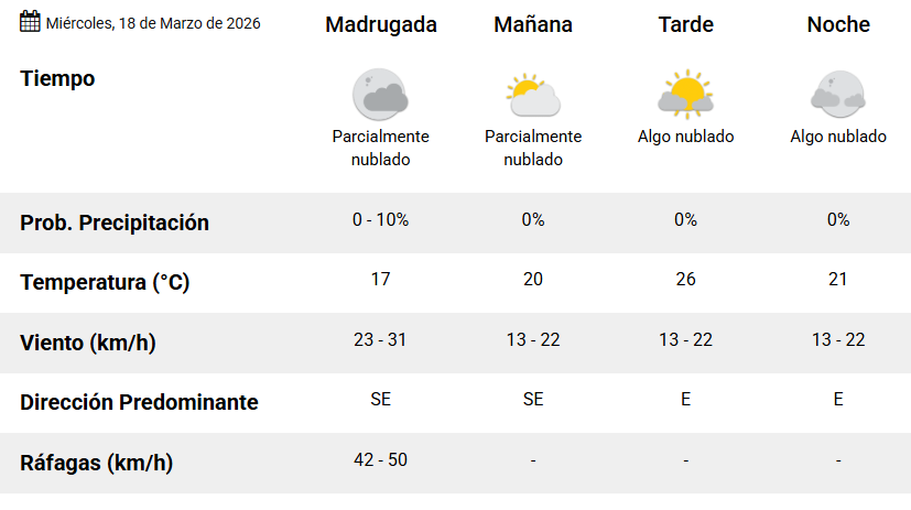 La temperatura mínima será de 17° y la máxima alcanzará los 26°, con un ascenso térmico hacia la tarde. Durante la madrugada se registraron vientos más intensos, con ráfagas de hasta 50 km/h, que irán disminuyendo con el correr de las horas.